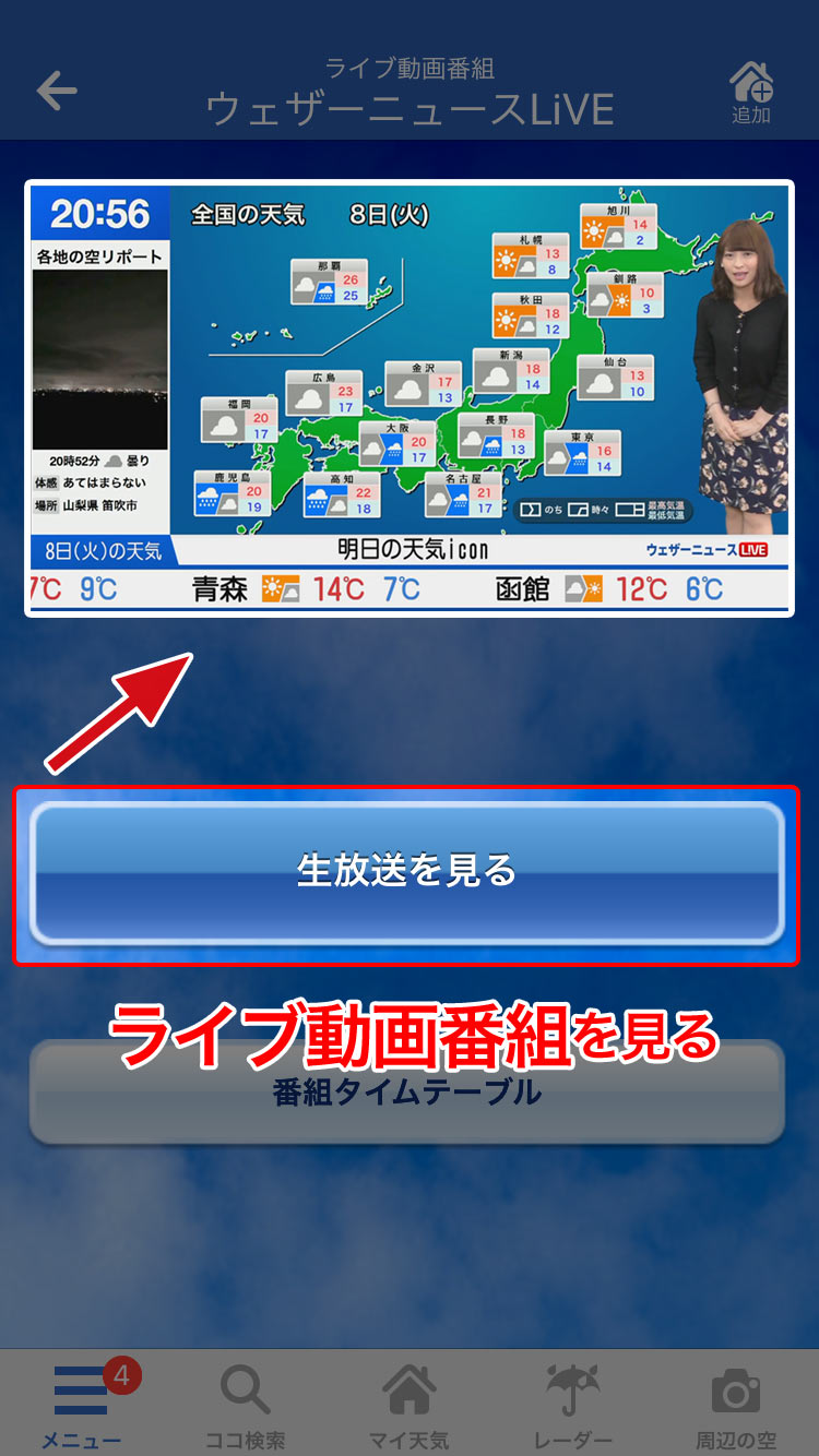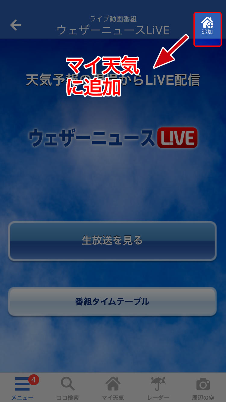 「ライブ動画番組」の使い方 ウェザーニュースが運営する24時間365日生放送の動画番組「ウェザーニュースLiVE」をご覧いただくことができます。 番組のタイムテーブルもご確認いただけます。 「追加」をタップすると、いま見ている画面をマイ天気に追加することができます。