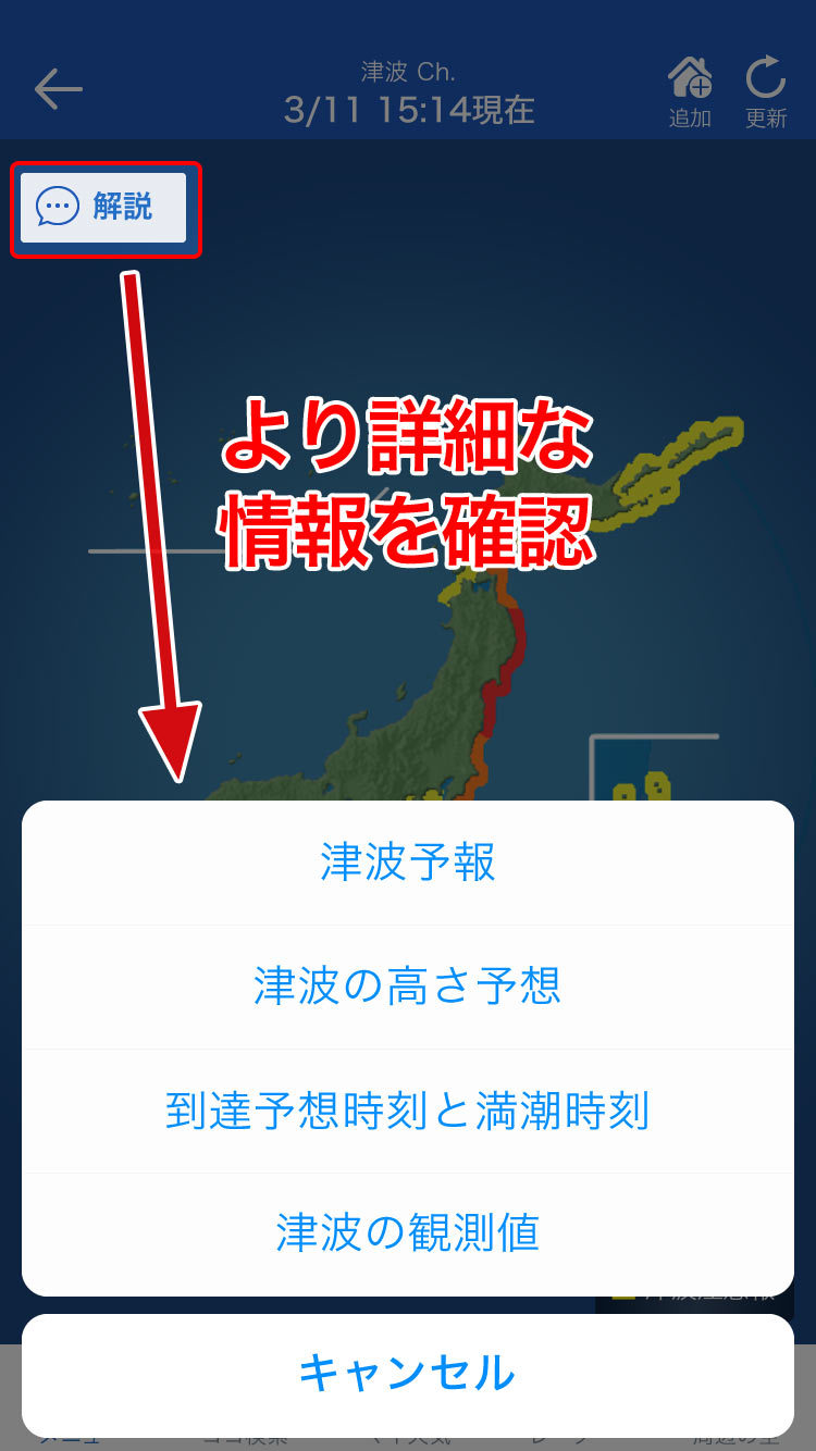 「解説」をタップすると、津波に関する詳細な情報をテキストで見ることができます(津波予報、津波の高さ予想、到達予想時刻と満潮時刻、津波の観測値)。