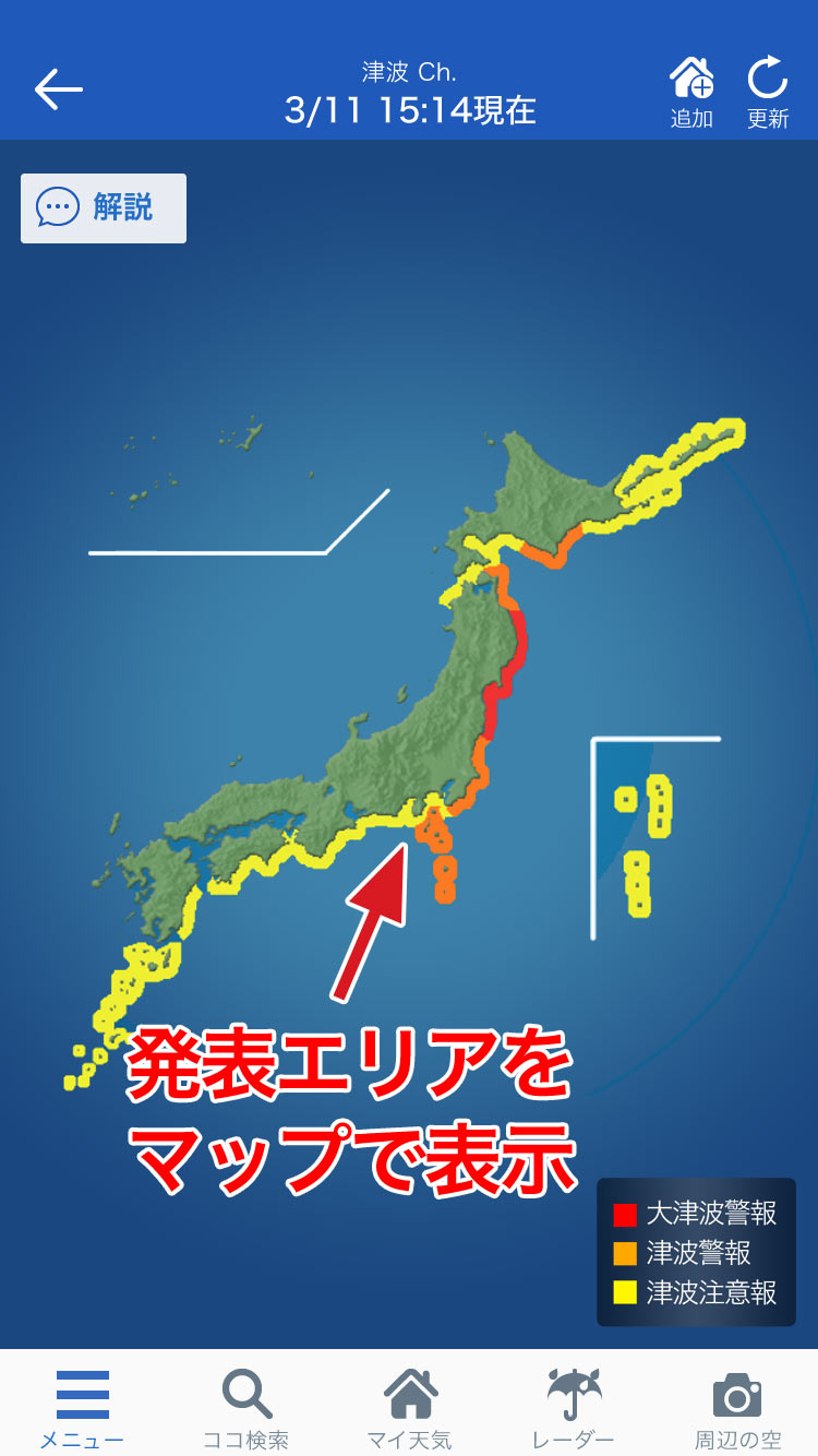 メニューから津波を選択すると、最新の津波情報が表示されます。