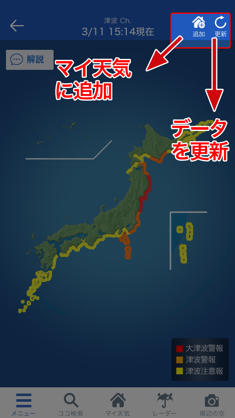「追加」をタップすると、津波Ch.をマイ天気に追加することができます。