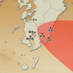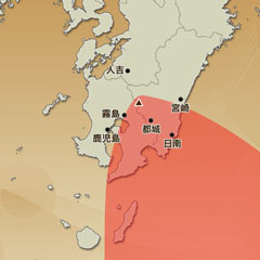 【2】新燃岳から約3km以内では噴火に伴う火砕流に警戒が必要です。(対象地域→宮崎県:小林市、高原町 鹿児島県:霧島市)