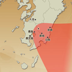 【2】新燃岳から約3km以内では噴火に伴う火砕流に警戒が必要です。(対象地域→宮崎県:小林市、高原町 鹿児島県:霧島市)