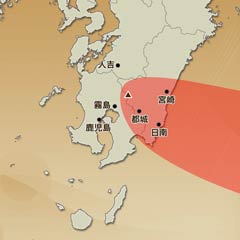 【2】新燃岳から約3km以内では噴火に伴う火砕流に警戒が必要です。(対象地域→宮崎県:小林市、高原町 鹿児島県:霧島市)