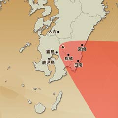 【2】新燃岳から約3km以内では噴火に伴う火砕流に警戒が必要です。(対象地域→宮崎県:小林市、高原町 鹿児島県:霧島市)