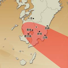 【2】新燃岳から約3km以内では噴火に伴う火砕流に警戒が必要です。(対象地域→宮崎県:小林市、高原町 鹿児島県:霧島市)