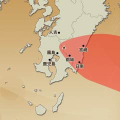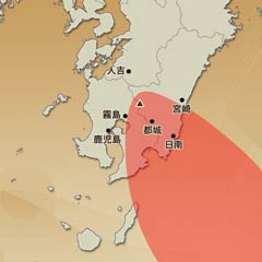 【2】新燃岳から約3km以内では噴火に伴う火砕流に警戒が必要です。(対象地域→宮崎県:小林市、高原町 鹿児島県:霧島市)