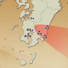 【2】新燃岳から約3km以内では噴火に伴う火砕流に警戒が必要です。(対象地域→宮崎県:小林市、高原町 鹿児島県:霧島市)