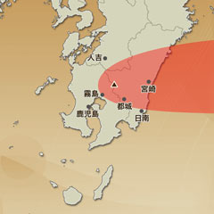 【2】新燃岳から約3km以内では噴火に伴う火砕流に警戒が必要です。(対象地域→宮崎県:小林市、高原町 鹿児島県:霧島市)