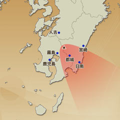 【2】新燃岳から約3km以内では噴火に伴う火砕流に警戒が必要です。(対象地域→宮崎県:小林市、高原町 鹿児島県:霧島市)