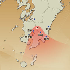 【2】新燃岳から約3km以内では噴火に伴う火砕流に警戒が必要です。(対象地域→宮崎県:小林市、高原町 鹿児島県:霧島市)