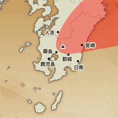 【2】新燃岳から約3km以内では噴火に伴う火砕流に警戒が必要です。(対象地域→宮崎県:小林市、高原町 鹿児島県:霧島市)