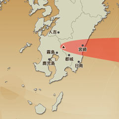 新燃岳が噴火した場合、噴煙は東方向へ流れる予想です。