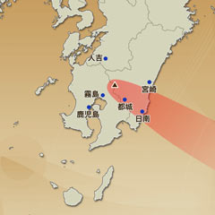 新燃岳が噴火した場合、噴煙は南東方向へ流れる予想です。