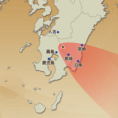 新燃岳が噴火した場合、噴煙は南東方向へ流れる予想です。