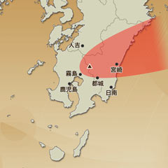 新燃岳が噴火した場合、噴煙は東~北東方向へ流れる予想です。