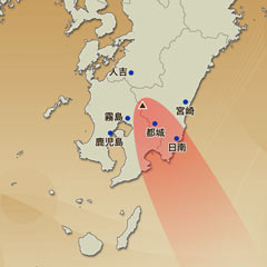 【2】新燃岳から約3km以内では噴火に伴う火砕流に警戒が必要です。(対象地域→宮崎県:小林市、高原町 鹿児島県:霧島市)