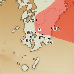 【2】新燃岳から約3km以内では噴火に伴う火砕流に警戒が必要です。(対象地域→宮崎県:小林市、高原町 鹿児島県:霧島市)