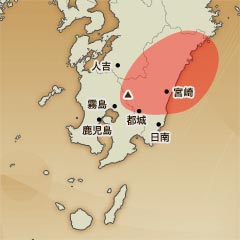【2】新燃岳から約3km以内では噴火に伴う火砕流に警戒が必要です。(対象地域→宮崎県:小林市、高原町 鹿児島県:霧島市)