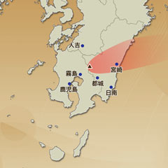 新燃岳が噴火した場合、噴煙は東北東方向へ流れます。