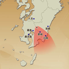 30(月)に新燃岳が噴火した場合、噴煙は南方向へ流れます。【宮崎県】