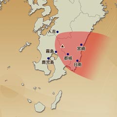 新燃岳が噴火した場合、噴煙は東方向へ流れます。【宮崎県】