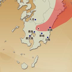 新燃岳が噴火した場合、噴煙は北東方向へ広がります。【宮崎県】