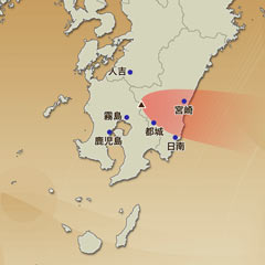 新燃岳が噴火した場合、噴煙は東方向へ流れます。【宮崎県】