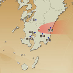新燃岳が噴火した場合、噴煙は、主に東(宮崎県側)へ流れます。ただ、雨の降っている時に噴火した場合、新燃岳周辺では灰混じりの雨になる可能性があります。【宮崎県】